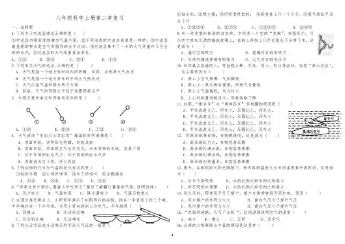 八年级科学上册第二章复习一.选择题1.下列关于对流层描述正确的是( )①对流层内随高度的增加气温升高;②不同地表的对流层高度是一样的;③对流层最显著的特点是空气有强烈的水平运动;④对流层集中了一半的大气质量和几乎全部的水汽;⑤对流层的天气现象复杂多变。