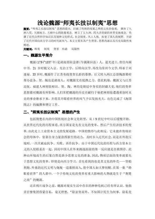 关键词:师夷制夷背景内涵局限性一、魏源生平简介魏源(1794~1857年)是湖南邵阳金潭(今属隆回县)人,道光进士,曾任内阁中书。