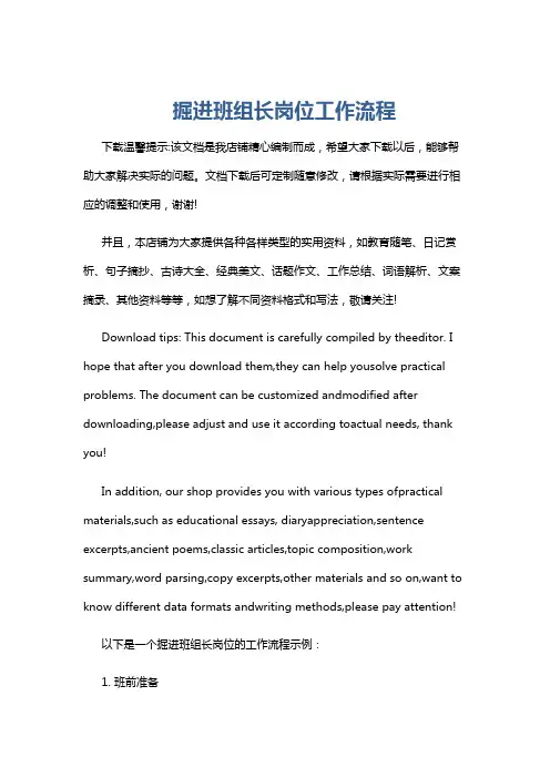 文档下载后可定制随意修改,请根据实际需要进行相应的调整和使用,谢谢!并且,本店铺为大家提供各种各样类型的实用资料,如教育随笔、日记赏析、句子摘抄、古诗大全、经典美文、话题作文、工作总结、词语解析、文案摘录、其他资料等等,如想了解不同资料格式和写法,敬请关注!Download tips: This document is carefully compiled by theeditor. I hope that after you download them,they can help yousolve practical problems. The document can be customized andmodified after downloading,please adjust and use it according toactual needs, thank you!In addition, our shop provides you with various types ofpractical materials,such as educational essays, diaryappreciation,sentence excerpts,ancient poems,classic articles,topic composition,work summary,word parsing,copy excerpts,other materials and so on,want to know different data formats andwriting methods,please pay attention!以下是一个掘进班组长岗位的工作流程示例:1. 班前准备提前到达工作现场,与上一班班组长进行交接,了解上一班的工作情况和存在的问题。