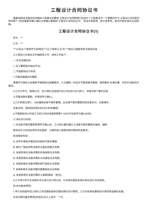 简易版工程设计合同范本1工程名称:工程地点:合同编号:(由设计方编填)设计证书等级:发包方:设计方:发包方委托设计方承担工程设计经双方协商一致签订本合同第1条本合同依据下列文件签订(1)《中华人民共和国合同法》、《中华人民共和国建筑法》、《建设工程勘察设计市场管理规定》(2)国家及地方有关建设工程勘察设计管理法规和规章、建设工程批准文件第2条本合同设计项目的内容:名称、规模、阶段、投资及设计费等见表4-2表4-2设计项目内容序号分项目名称建设规模设计阶段及内容估算总投资(万元)费率(%)估算设计费(元)层数建筑面积(平方米)方案初步设计施工图第3条发包方应向设计方提交表4-3中的有关资料及文件表4-3发包方应提供的资料序号资料及文件名称份数提交日期有关事宜第4条设计方应向发包方交付的设计资料及文件如表4-4所示表4-4设计方应交付的资料序号资料及文件名称份数提交日期有关事宜第5条本合同设计收费估算为元人民币设计费支付进度详见表4-5所示表4-5设计费支付进度付费次序占总设计费比例付费额(元)付费时间(由设计文件的交付时间决定) 第一次付费20%定金本合同签订后三日内第二次付费第三次付费说明:1.提交各阶段设计文件的同时支付各阶段设计费;2.在提交最后一部分施工图的同时结清全部设计费不留尾款;3.实际设计费按初步设计概算(施工图设计概算)核定多退少补实际设计费与估算设计费出现差额时双方另行签订补充协议;4.本合同履行后定金抵作设计费第6条双方责任(1)发包方责任①发包方按本合同第3条规定的内容在规定的时间内向设计方提交资料及文件并对其完整性、正确性及时效性负责发包方不得要求设计方违反国家有关标准进行设计发包方提交上述资料及文件超过规定期限15天以内设计方按合同第4条规定将交付设计文件的时间顺延;超过规定期限15天以上时设计方有权重新确定提交设计文件的时间②发包方变更委托设计项目、规模、条件或因提交的资料错误或将所提交资料做较大修改以致设计方需返工时双方除需另行协商签订补充协议(或另订合同)、重新明确有关条款外发包方应按设计方所耗工作量向设计方增付设计费③在未签合同前发包方已同意设计方为发包方所做的各项设计工作应按收费标准相应支付的设计费④发包方要求设计方比合同规定时间提前交付设计资料及文件时如果设计方能够做到发包方应根据设计方提前投入的工作量向设计方支付赶工费⑤发包方应为派赴现场处理有关设计问题的工作人员提供必要的工作、生活及交通等方便条件⑥发包方应保护设计方的投标书、设计方案、文件、资料图纸、数据、计算软件和专利技术未经设计方同意发包方对设计方交付的设计资料及文件不得擅自修改、复制或向第三方转让或用于本合同外的项目如发生以上情况发包方应负相关法律责任设计方有权向发包方提出索赔(2)设计方责任①设计方应按国家技术规范、标准、规程及发包方提出的设计要求进行工程设计按合同规定的进度要求提交质量合格的设计资料并对其负责②设计合理使用年限为年③设计方按本合同第2条和第4条规定的内容、进度及份数向发包方交付资料及文件④设计方交付设计资料及文件后要按规定参加有关的设计审查并根据审查结论负责对不超出原定范围的内容做必要的调整补充设计方按合同规定时限交付设计资料及文件本年内项目开始施工的负责向发包方及施工单位进行设计交底、处理有关设计问题和参加竣工验收一年内项目尚未开始施工的设计方仍负责上述工作但应按所需工作量向发包方适当收取咨询服务费具体金额由双方商定⑤设计方应保护发包方的知识产权不得向第三方泄露、转让发包方提交的图纸等技术经济资料如发生以上情况并给发包方造成经济损失发包方有权向设计方索赔第7条违约责任(1)在合同履行期间发包方要求终止或解除合同设计方未开始设计工作的不退还发包方已付的定金;已开始设计工作的发包方应根据设计方已进行的实际工作量支付设计费不足一半时按该阶段设计费的一半支付;超过一半时支付全部的该阶段设计费(2)发包方应按本合同第5条规定的金额和时间向设计方支付设计费每逾期支付一天应承担支付金额千分之二的逾期违约金逾期超过三十天以上时设计方有权暂停履行下阶段工作并书面通知发包方发包方的上级或设计审批部门对设计文件不审批或本合同项目停缓建时发包方均按第7条第(1)款的相关规定支付设计费(3)设计方对设计资料及文件出现的遗漏或错误负责修改或补充由于设计方错误造成工程质量事故损失设计方除负责采取补救措施外应免收直接受损失部分的设计费损失严重的根据损失的程度和设计方责任大小向发包方支付赔偿金赔偿金由双方商定为实际损失的%(4)由于设计方自身原因延误了按本合同第4条规定的设计资料及设计文件的交付时间时每延误一天应减收该项目应收设计费的千分之二(5)合同生效后设计方要求终止或解除合同时设计方应双倍返还定金第8条其他相关事宜(1)发包方要求设计方派专人留驻施工现场进行配合与解决有关问题时双方应另行签订补充协议或技术咨询服务合同(2)设计方为本合同项目所采用的国家或地方标准图由发包方自费向有关出版部门购买本合同
