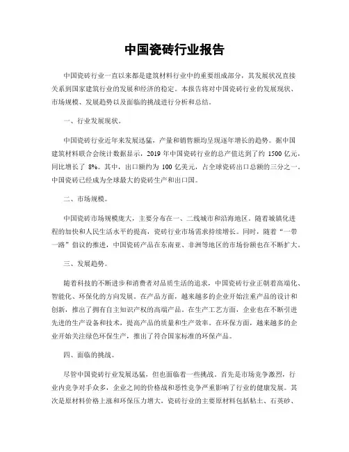 中国瓷砖行业报告中国瓷砖行业一直以来都是建筑材料行业中的重要组成部分,其发展状况直接关系到国家建筑行业的发展和经济的稳定。