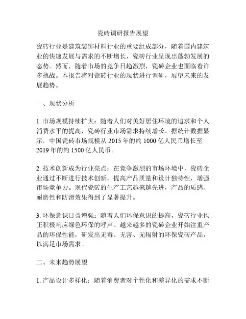 二、未来趋势展望1. 产品设计多样化:随着消费者对个性化和差异化的需求不断增加,瓷砖企业将注重产品设计的多样化和创新。