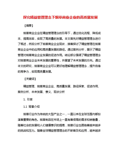浅谈烟草企业精益管理烟草企业精益管理(Lean management)是一种以精益思维和方法为基础的管理理念,目的是实现资源最优利用,提高生产效率和质量。