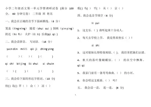 小学二年级语文第一单元学情调研试卷(满分100 分,60 分钟完卷)二年级班姓名一、我会在正确的音节下面画横线。