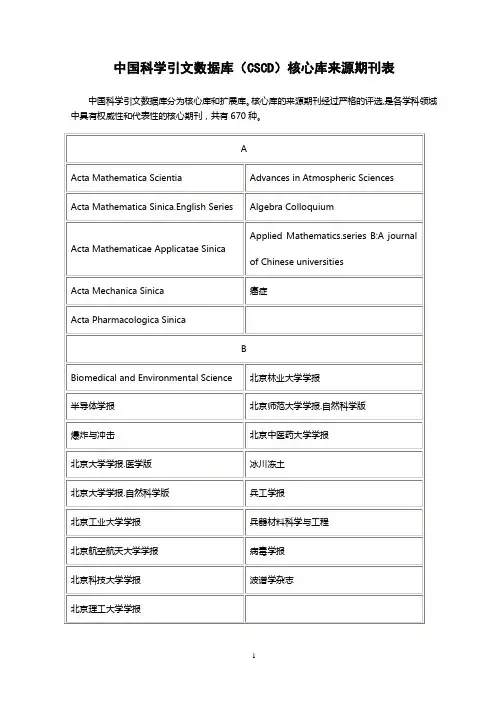 中国科学引文数据库来源期刊列表(2021-2022年度)序号期刊名称ISSN 备注2 Acta Biochimica et Biophysica Sinica 1672-9145 核心库3 Acta Geochimica 2096-0956 核心库4 Acta Geologica Sinica 1000-9515 核心库5 Acta Mathematica Scientia 0252-9602 核心库6 Acta Mathematica Sinica. English Series 1439-8516 核心库7 Acta Mathematicae Applicatae Sinica 0168-9673 核心库8 Acta Mechanica Sinica 0567-7718 核心库9 Acta Mechanica Solida Sinica 0894-9166 核心库10 Acta Metallurgica Sinica(English Letters) 1006-7191 核心库11 Acta Oceanologica Sinica 0253-505X 核心库12 Acta Pharmaceutica Sinica B 2211-3835 核心库13 Acta Pharmacologica Sinica 1671-4083 核心库14 Advanced Photonics 2577-5421 核心库15 Advances in Atmospheric Sciences 0256-1530 核心库16 Advances in Climate Change Research 1674-9278 核心库17 Advances in Manufacturing 2095-3127 核心库18 Advances in Polar Science 1674-9928 核心库19 Algebra Colloquium 1005-3867 核心库20 Analysis in Theory and Applications 1672-4070 核心库21 Animal Models and Experimental Medicine 2096-5451 核心库22 Animal Nutrition 2405-6545 核心库23 Applied Geophysics 1672-7975 核心库24 Applied Mathematics and Mechanics 0253-4827 核心库25 Applied Mathematics. Series B, A Journal of1005-1031 核心库Chinese Universities26 Asian Herpetological Research 2095-0357 核心库27 Asian Journal of Andrology 1008-682X 核心库28 Asian Journal of Urology 2214-3882 核心库29 Astrodynamics 2522-008X 核心库30 Atmospheric and Oceanic Science Letters 1674-2834 核心库31 Automotive Innovation 2096-4250 核心库32 Avian Research 2055-6187 核心库33 Bio-Design and Manufacturing 2096-5524 核心库34 Biomedical and Environmental Sciences 0895-3988 核心库35 Biophysics Reports 2364-3439 核心库36 Biosafety and Health 2096-6962 核心库37 Bone Research 2095-4700 核心库38 Building Simulation 1996-3599 核心库39 Built Heritage 2096-3041 核心库40 Cancer Biology and Medicine 2095-3941 核心库41 Cell Research 1001-0602 核心库42 Cellular & Molecular Immunology 1672-7681 核心库43 CES Transactions on Electrical Machines and2096-3564 核心库Systems44 Chemical Research in Chinese Universities 1005-9040 核心库45 China City Planning Review 1002-8447 核心库46 China Communications 1673-5447 核心库47 China Ocean Engineering 0890-5487 核心库48 Chinese Annals of Mathematics. Series B 0252-9599 核心库49 Chinese Chemical Letters 1001-8417 核心库50 Chinese Geographical Science 1002-0063 核心库51 Chinese Journal of Acoustics 0217-9776 核心库52 Chinese Journal of Aeronautics 1000-9361 核心库53 Chinese Journal of Cancer Research 1000-9604 核心库54 Chinese Journal of Chemical Engineering 1004-9541 核心库55 Chinese Journal of Chemical Physics 1674-0068 核心库56 Chinese Journal of Chemistry 1001-604X 核心库57 Chinese Journal of Electrical Engineering 2096-1529 核心库58 Chinese Journal of Electronics 1022-4653 核心库59 Chinese Journal of Integrative Medicine 1672-0415 核心库60 Chinese Journal of Mechanical Engineering 1000-9345 核心库61 Chinese Journal of Natural Medicines 2095-6975 核心库62 Chinese Journal of Polymer Science 0256-7679 核心库63 Chinese Journal of Structural Chemistry 0254-5861 核心库64 Chinese Journal of Traumatology 1008-1275 核心库65 Chinese Medical Journal 0366-6999 核心库66 Chinese Medical Sciences Journal 1001-9294 核心库67 Chinese Neurosurgical Journal 2095-9370 核心库68 Chinese Optics Letters 1671-7694 核心库69 Chinese Physics Letters 0256-307X 核心库70 Chinese Physics. B 1674-1056 核心库71 Chinese Physics. C 1674-1137 核心库72 Chronic Diseases and Translational Medicine 2095-882X 核心库73 Communications in Mathematical Research 1674-5647 核心库74 Communications in Theoretical Physics 0253-6102 核心库75 Computational Visual Media 2096-0433 核心库76 Control Theory and Technology 2095-6983 核心库77 CSEE Journal of Power and Energy systems 2096-0042 核心库78 Current Zoology 1674-5507 核心库79 Cybersecurity 2523-3246 核心库80 Defence Technology 2096-3459 核心库81 Digital Communications and Networks 2352-8648 核心库82 Earth and Planetary Physics 2096-3955 核心库83 Earthquake Engineering and Engineering Vibration 1671-3664 核心库84 Earthquake Research in China 0891-4176 核心库85 Energy and Environmental Material 2575-0356 核心库86 Entomotaxonomia 2095-8609 核心库87 Eye and Vision 2326-0254 核心库88 Food Quality and Safety 2399-1399 核心库89 Forensic Sciences Research 2096-1790 核心库90 Forest Ecosystems 2095-6355 核心库91 Friction 2223-7690 核心库92 Frontiers in Energy 2095-1701 核心库93 Frontiers of Architectural Research 2095-2635 核心库94 Frontiers of Chemical Science and Engineering 2095-0179 核心库95 Frontiers of Computer Science 2095-2228 核心库96 Frontiers of Earth Science 2095-0195 核心库97 Frontiers of Environmental Science & Engineering 2095-2201 核心库2095-9184 核心库98 Frontiers of Information Technology & ElectronicEngineering99 Frontiers of Materials Science 2095-025X 核心库100 Frontiers of Mathematics in China 1673-3452 核心库101 Frontiers of Mechanical Engineering 2095-0233 核心库102 Frontiers of Medicine 2095-0217 核心库103 Frontiers of Optoelectronics 2095-2759 核心库104 Frontiers of Physics 2095-0462 核心库105 Frontiers of Structural and Civil Engineering 2095-2430 核心库106 General Psychiatry 2096-5923 核心库107 Genomics, Proteomics & Bioinformatics 1672-0229 核心库108 Geodesy and Geodynamics 1674-9847 核心库109 Geoscience Frontiers 1674-9871 核心库110 Geo-spatial Information Science 1009-5020 核心库111 Global Energy Interconnection 2096-5117 核心库112 Green Energy & Environment 2096-2797 核心库113 Hepatobiliary & Pancreatic Diseases International 1499-3872 核心库114 High Power Laser Science and Engineering 2095-4719 核心库115 Horticultural Plant Journal 2095-9885 