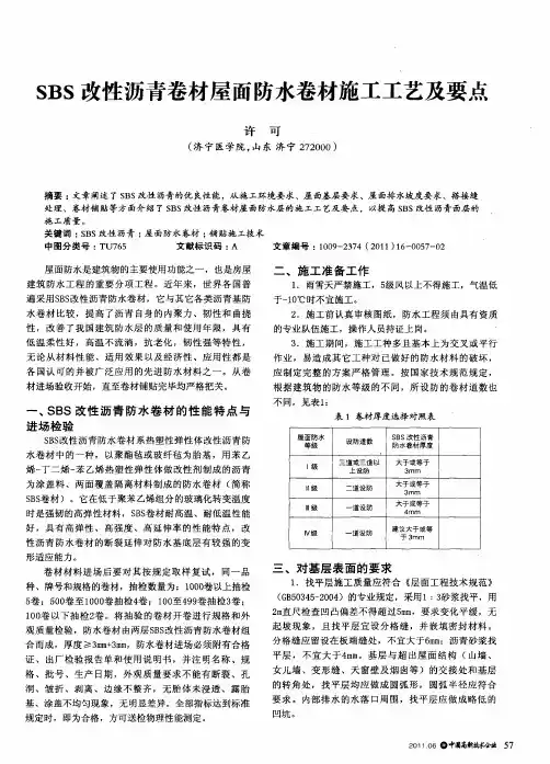 地下室SBS改性沥青防水卷材施工方案_3一、施工前准备在进行地下室SBS改性沥青防水卷材施工之前,需要做好以下准备工作:1. 材料准备•防水卷材:选择符合规定标准的SBS改性沥青防水卷材,数量要充足。