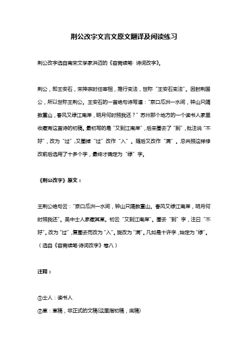 荆公改字文言文原文翻译及阅读练习荆公改字选自南宋文学家洪迈的《容斋续笔·诗词改字》。