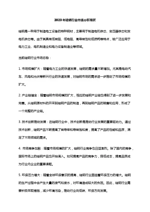 五、市场趋势1. 技术创新取向硅钢市场对产品的性能和质量要求越来越高,因此技术创新是市场发展的关键。