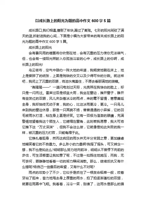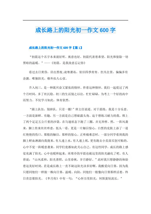 成长路上的阳光作文600字成长路上的阳光初中作文〔优秀6篇〕光阴似箭,日月如梭,转眼间我们就开始了初中的繁忙学业,尽管只和小学部间隔了一条“樱花大道〞,但常常在初中部还没放学时,小学部就已人去楼空。
