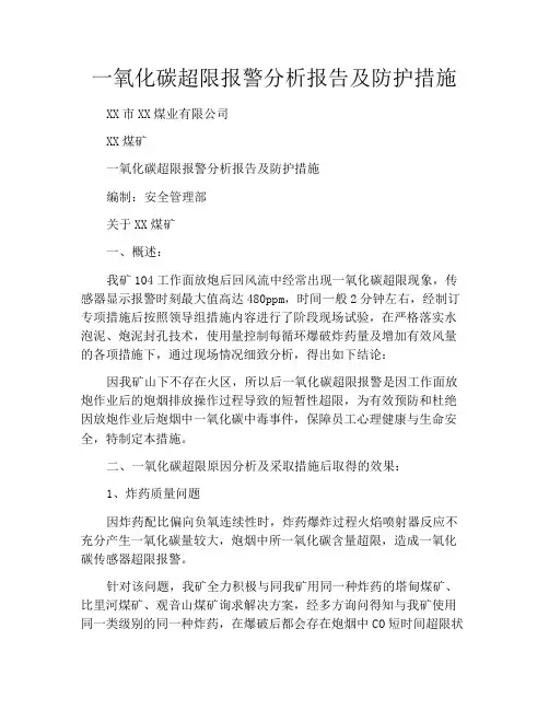 玉溪市东方煤业有限公司华盖山煤矿一氧化碳超限报警分析报告及防护措施编制:安全管理部2016 年4 月关于华盖山煤矿一氧化碳超限报警分析报告及防护措施一、概述:我矿104 工作面放炮后回风流中经常出现一氧化碳超限现象,传感器显示报警时刻最大值高达480ppm,时间一般2分钟左右,经制定专项措施后按照措施内容进行了阶段现场试验,在严格落实水泡泥、炮泥封孔技术,控制每循环爆破炸药量及增加有效风量的各项措施下,通过现场情况细致分析,得出如下结论:因我矿井下不存在火区,所以一氧化碳超限报警是因工作面放炮作业后的炮烟排放过程导致的短暂性超限,为有效预防和杜绝因放炮作业后炮烟中一氧化碳中毒事件,保障员工身体健康与生命安全,特制定本措施。