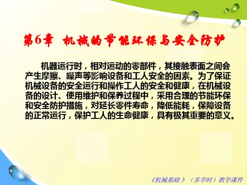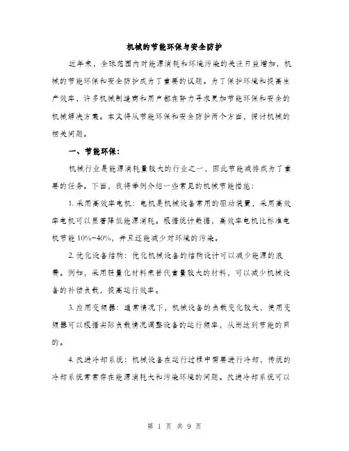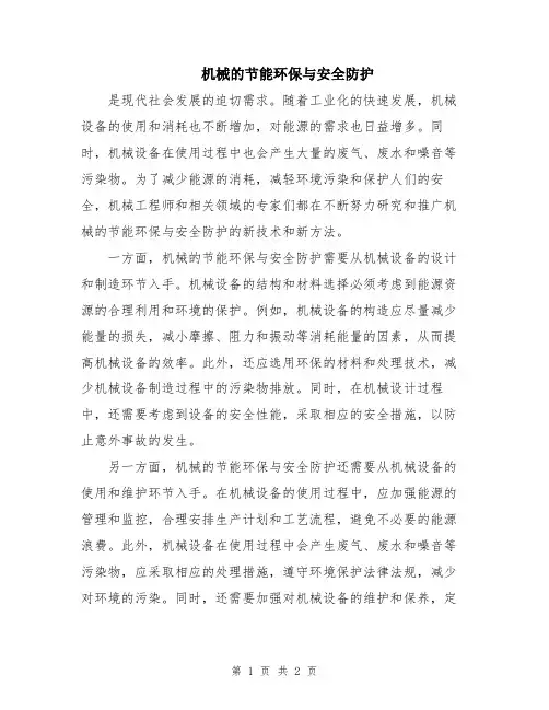 三、机械设备的环保问题1. 在使用机械设备过程中,应尽量减少噪音和振动的产生,可以采取隔音隔振措施,如安装减震垫、降噪罩等,减少对周围环境和操作人员的影响。