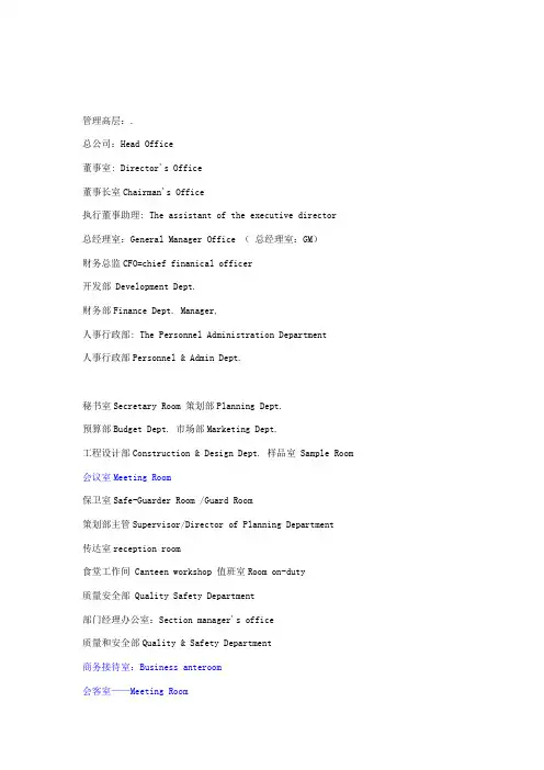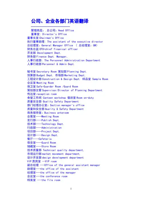 公司、企业各部门英语翻译---------------------------管理高层:.总公司:Head Office董事室: Director's Office董事长室Chairman's Office执行董事助理: The assistant of the executive director总经理室:General Manager Office (总经理室:GM)财务总监CFO=chief finanical officer开发部 Development Dept.财务部Finance Dept. Manager,人事行政部: The Personnel Administration Department人事行政部Personnel & Admin Dept.秘书室Secretary Room 策划部Planning Dept.预算部Budget Dept. 市场部Marketing Dept.工程设计部Construction & Design Dept. 样品室 Sample Room 会议室Meeting Room保卫室Safe-Guarder Room /Guard Room策划部主管Supervisor/Director of Planning Department传达室reception room食堂工作间 Canteen workshop 值班室Room on-duty质量安全部 Quality Safety Department部门经理办公室:Section manager's office质量和安全部Quality & Safety Department商务接待室:Business anteroom会客室——Meeting Room发行部——Publish Dept.技术部——Technology Dept.行政部——Administration项目部——Project Dept.设计部——Design Dept.餐厅——Cafeteria保安室——Guard Room储藏室——Store Room技术质量部 Technical quality department,市场运行部market movement department,设计开发部design development departmentVIP贵宾室 --VIP room副总经理 ---Office of the general assistant manager助理室---the office of the assistant经理室---the office of the manager会议室---the conference room档案室 ---the file room签约室一---Reception Room one签约室二 ---Reception Room Two签约室三--- Reception Room Three更衣室---Dressing Room办公室---office储藏室---closet财务部---accounting department策划部---strategy department(division)副总室 ---the office of vice president营销部---the sales department工程部--- engineering department总师室--the office the general engineer经理室---office of the manager物业管理 ---property management促销部 sales promotion Dept.总务部 Gernal affairs Dept.策划部,启化部.drafting barracks营业部 Business Offices公共关系部Public Relations Dept.***************************************是指华盛敦的计划Architect 是指华盛敦的计划策划者.行政部administration department 经理室manager's office销售部marketing deparment电脑室computer center Dept. 人事部 HR Dept.财务结算室 Settlement Room 董事、总裁 President Office董事、副总裁 Director Office / Vice-President Office总裁办公室President’s Assistant Office总裁办、党办President’s Assistant O ffice General Committee Office 资产财务部 Finanical Dept.。