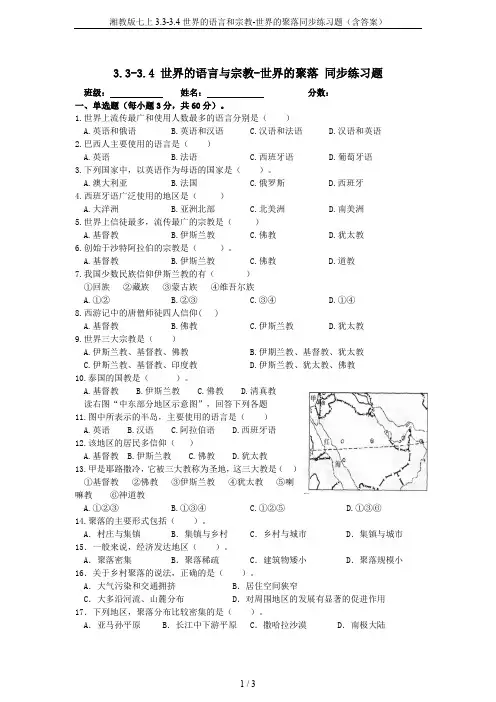 3.3-3.4 世界的语言与宗教-世界的聚落同步练习题班级:姓名:分数:一、单选题(每小题3分,共60分)。