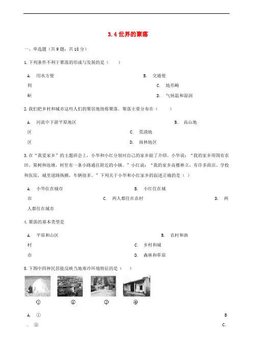 3.4世界的聚落一、单选题(共9题;共18分)1.下列条件不利于聚落的形成与发展的是()A. 用水方便B. 交通便利 C. 地形崎岖 D. 气候温和湿润2.我们把乡村和城市这些人们的聚居地统称聚落.聚落主要分布在()A. 河流中下游平原地区B. 高山地区 C. 荒漠地区 D. 雨林地区3.在“我爱家乡”的主题班会上,小华和小红分别对自己的家乡做了介绍。