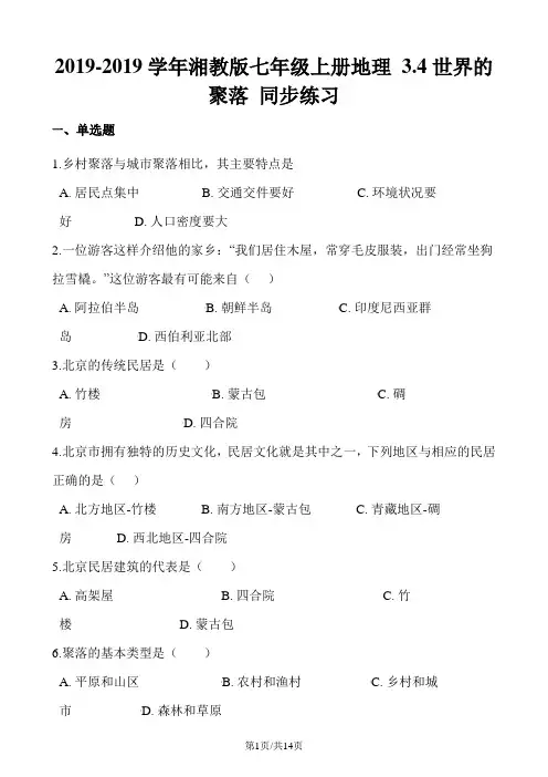 2019-2019学年湘教版七年级上册地理3.4世界的聚落同步练习一、单选题1.乡村聚落与城市聚落相比,其主要特点是A. 居民点集中B. 交通交件要好C. 环境状况要好D. 人口密度要大2.一位游客这样介绍他的家乡:“我们居住木屋,常穿毛皮服装,出门经常坐狗拉雪橇。