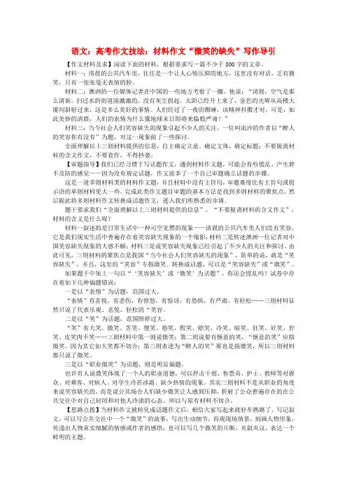 语文:高考作文技法:材料作文“微笑的缺失”写作导引【作文材料及求】阅读下面的材料,根据要求写—篇不少于800字的文章。