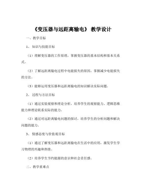 《变压器与远距离输电》教学设计一、教学目标1、知识与技能目标(1)理解变压器的工作原理,掌握变压器的基本结构和变压规律。