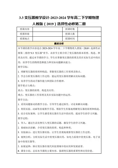 三、教学方法1、讲授法:讲解变压器和远距离输电的基本概念和原理。
