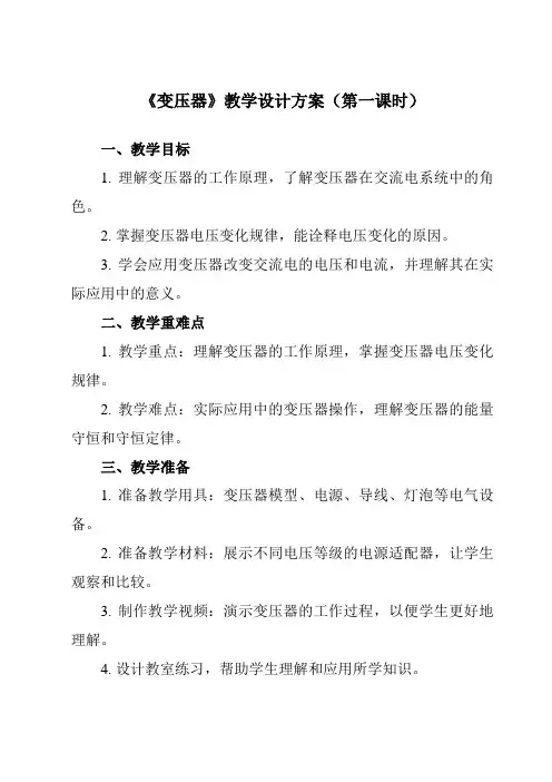 《变压器》教学设计方案(第一课时)一、教学目标1. 理解变压器的工作原理,了解变压器在交流电系统中的角色。