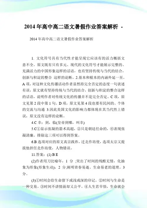 高二语文暑假作业及答案解析(2021最新版)作者:______编写日期:2021年__月__日A.对峙/投掷祈祷/倒春寒诡谲/一蹶不振B.扁舟/扁平启碇/沉淀物脊椎/椎心泣血C.拓印/拖沓抹粉/抹不开铂金/厚此薄彼D.复辟/精辟戏谑/头皮屑惬意/翻箱倒箧解析:A项,zhì,dǎo/dào,jué;B 项,piān/biǎn,dìng/diàn,zhuī/chuí;C项,tà,mǒ/mò,bó;D项,bì/pì,xuè/xiè,qiè。