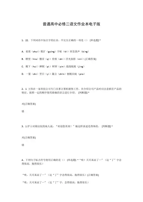 [判断题] *对(正确答案)错11、下列选项中加着重号字读音与其它三项不相同的一项是()[单选题] *A、嗜好(正确答案)B、麻痹C、刚愎自用D、包庇12、下列各组句子中,加点词的意义和用法相同的一项是()[单选题] * A.让大行不顾细谨,大礼不辞小让使者大喜,如惠语以让单于B.息请息交以绝游门衰祚薄,晚有儿息C.直直不百步耳,是亦走也直好世俗之乐耳(正确答案)D.族族秦者秦也,非天下也山东豪俊遂并起而亡秦族矣13、1自我介绍关系到能否给人一个良好的“第一印象”,因此在自我介绍时可以适当夸大自己取得的成绩。