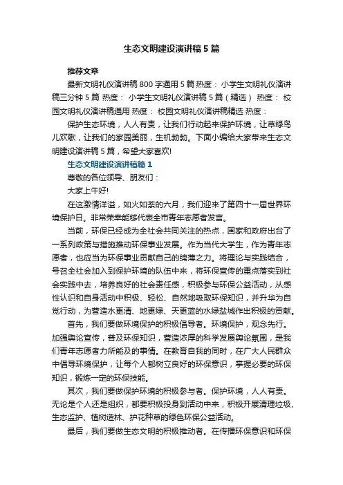文档下载后可定制修改,请根据实际需要进行调整和使用,谢谢!并且,本店铺为大家提供各种类型的经典范文,如演讲致辞、总结报告、心得体会、合同协议、条据文书、策划方案、导游词、教学资料、作文大全、其他范文等等,想了解不同范文格式和写法,敬请关注!Download tips: This document is carefully compiled by this editor. I hope that after you download it, it can help you solve practical problems. The document can be customized and modified after downloading, please adjust and use it according to actual needs, thank you!Moreover, our store provides various types of classic sample essays for everyone, such as speeches, summary reports, insights, contract agreements, documentary evidence, planning plans, tour guides, teaching materials, complete essays, and other sample essays. If you want to learn about different formats and writing methods of sample essays, please stay tuned!生态文明建设演讲稿5篇保护生态环境,人人有责,让我们行动起来保护环境,让草绿鸟儿欢歌,让我们的家园美丽,生机勃勃。