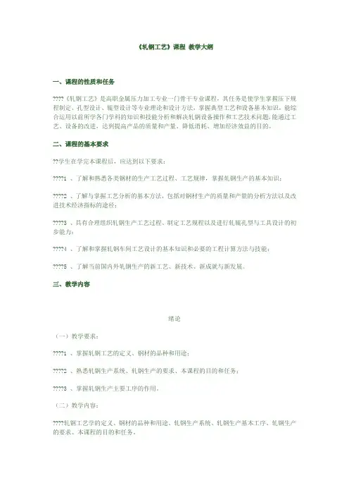 《轧钢工艺》课程教学大纲一、课程的性质和任务????《轧钢工艺》是高职金属压力加工专业一门骨干专业课程,其任务是使学生掌握压下规程制定、孔型设计、辊型设计等专业理论和设计方法,掌握典型工艺和设备基本知识,能综合运用以前所学各门学科的知识和技能分析和解决轧钢设备操作和工艺技术问题,能通过工艺、设备的改进,达到提高产品的质量和产量、降低消耗、增加经济效益的目的。