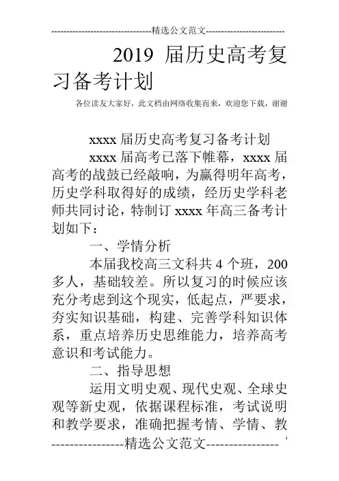 2019届历史高考复习备考计划各位读友大家好,此文档由网络收集而来,欢迎您下载,谢谢xxxx届历史高考复习备考计划xxxx届高考已落下帷幕,xxxx届高考的战鼓已经敲响,为赢得明年高考,历史学科取得好的成绩,经历史学科老师共同讨论,特制订xxxx年高三备考计划如下:一、学情分析本届我校高三文科共4个班,200多人,基础较差。