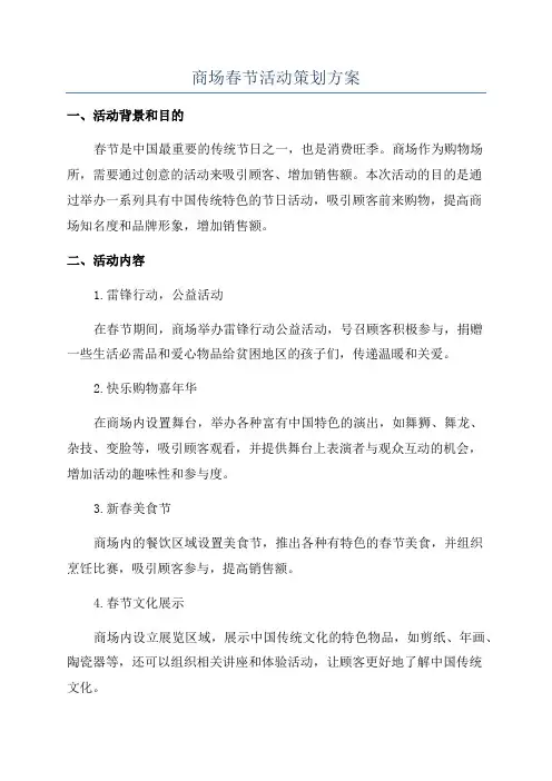 商场春节节日活动策划方案一、活动背景春节是中国传统的重要节日之一,也是商场的重要销售节点。