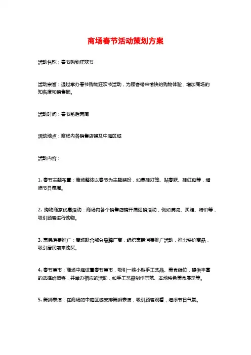 商场春节活动策划方案活动名称:春节购物狂欢节活动宗旨:通过举办春节购物狂欢节活动,为顾客带来愉快的购物体验,增加商场的知名度和销售额。