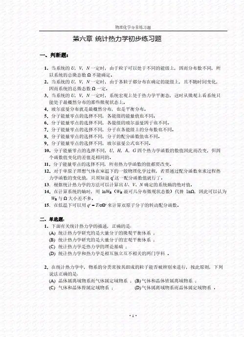 第六章统计热力学初步练习题一、判断题:1.当系统的U,V,N一定时,由于粒子可以处于不同的能级上,因而分布数不同,所以系统的总微态数Ω不能确定。
