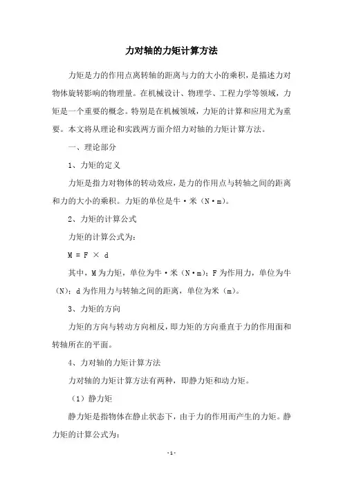 力对轴的力矩计算方法力矩是力的作用点离转轴的距离与力的大小的乘积,是描述力对物体旋转影响的物理量。