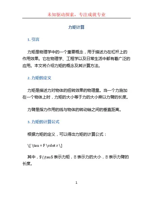 2、力矩的计算公式力矩的计算公式为:M = F × d其中,M为力矩,单位为牛·米(N·m);F为作用力,单位为牛(N);d为作用力与转轴之间的距离,单位为米(m)。