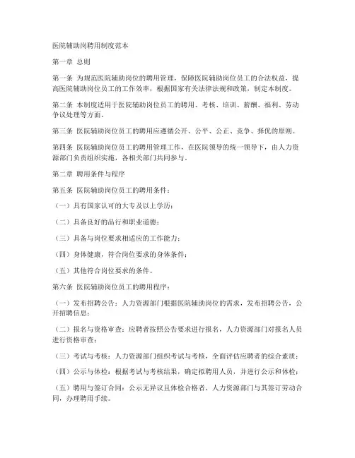 第一章总则第一条为加强医院辅助服务人员的管理,提高医疗服务质量,保障患者安全,根据《中华人民共和国医院管理条例》及相关法律法规,结合我院实际情况,制定本制度。