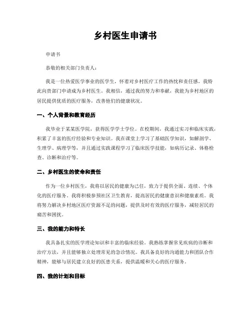 三、申请理由1. 专业背景:我具备扎实的医学专业知识,能够为乡村居民提供专业的医疗服务。