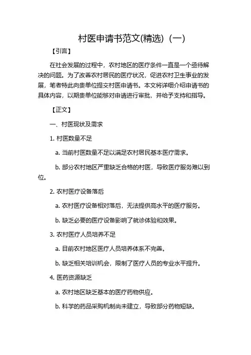 四、申请理由1. 对乡村医疗事业的热爱和责任感我深知乡村地区医疗资源匮乏,居民们面临着较大的医疗困难。