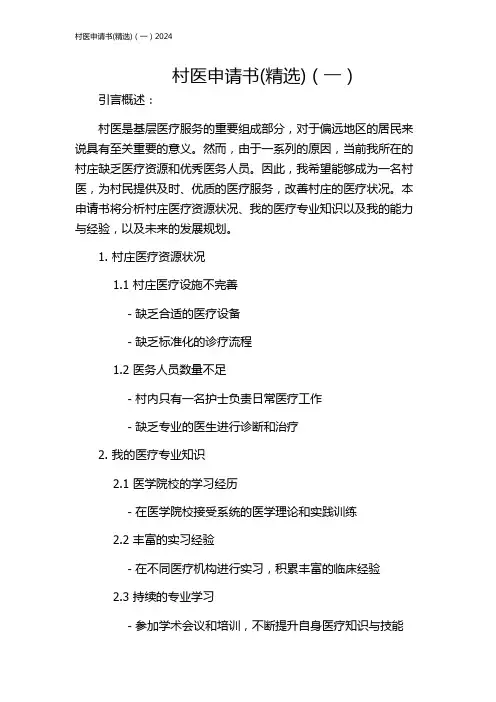 六、结束语我对乡村医疗事业充满了信心和热情,相信通过我的努力和贵村的支持,我能够成为一名优秀的乡村医生,为贵村的人民带去健康与希望。