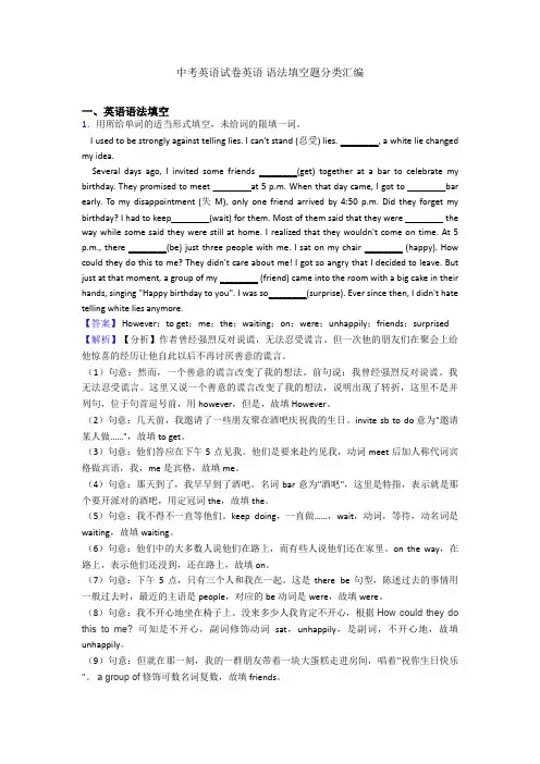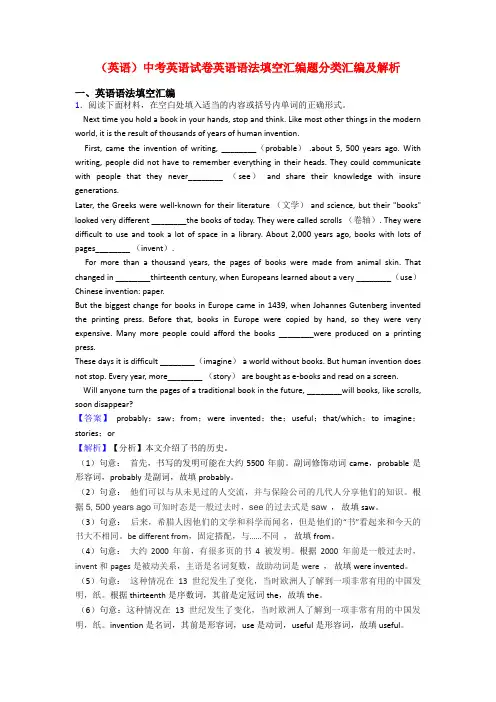 (英语)中考英语试卷英语语法填空汇编题分类汇编及解析一、英语语法填空汇编1.阅读下面材料,在空白处填入适当的内容或括号内单词的正确形式。