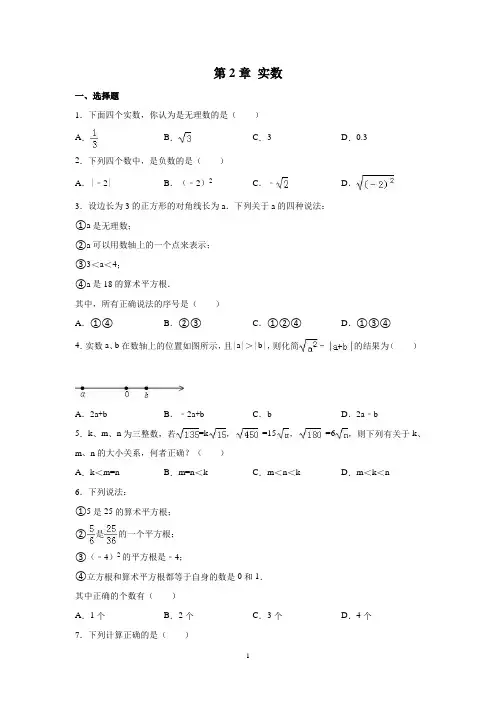第2章实数一、选择题1.下面四个实数,你认为是无理数的是()A.B.C.3 D.0.32.下列四个数中,是负数的是()A.|﹣2|B.(﹣2)2C.﹣D.3.设边长为3的正方形的对角线长为a.下列关于a的四种说法:①a是无理数;②a可以用数轴上的一个点来表示;③3<a<4;④a是18的算术平方根.其中,所有正确说法的序号是()A.①④B.②③C.①②④D.①③④4.实数a、b在数轴上的位置如图所示,且|a|>|b|,则化简的结果为()A.2a+b B.﹣2a+b C.b D.2a﹣b5.k、m、n为三整数,若=k,=15,=6,则下列有关于k、m、n的大小关系,何者正确?()A.k<m=n B.m=n<k C.m<n<k D.m<k<n6.下列说法:①5是25的算术平方根;②是的一个平方根;③(﹣4)2的平方根是﹣4;④立方根和算术平方根都等于自身的数是0和1.其中正确的个数有()A.1个B.2个C.3个D.4个7.下列计算正确的是()A.=×B.=﹣C.=D.=8.如图,下列各数中,数轴上点A表示的可能是()A.4的算术平方根B.4的立方根C.8的算术平方根D.8的立方根9.下列各式正确的是()A.B.C.D.10.规定用符号[m]表示一个实数m的整数部分,例如:[]=0,[3.14]=3.按此规定[]的值为()A.3 B.4 C.5 D.6二、填空题11.﹣的相反数是.12.16的算术平方根是.13.写出一个比﹣3大的无理数是.14.化简﹣=.15.比较大小:2π(填“>”、“<”或“=”).16.已知一个正数的平方根是3x﹣2和5x+6,则这个数是.17.若x,y为实数,且|x+2|+=0,则(x+y)2014的值为.18.已知m=,则m2﹣2m﹣2013=.三、解答题(共66分)19.(2012﹣π)0﹣()﹣1+|﹣2|+;(2)1+(﹣)﹣1﹣÷()0.20.先化简,再求值:(1)(a﹣2b)(a+2b)+ab3÷(﹣ab),其中a=,b=;(2)(2x+3)(2x﹣3)﹣4x(x﹣1)+(x﹣2)2,其中x=﹣.21.有这样一个问题:与下列哪些数相乘,结果是有理数?A、;B、;C、;D、;E、0,问题的答案是(只需填字母):;(2)如果一个数与相乘的结果是有理数,则这个数的一般形式是什么(用代数式表示).22.计算:(1)++﹣;(2)2÷×;(3)(﹣4+3)÷2.23.甲同学用如图方法作出C点,表示数,在△OAB中,∠OAB=90°,OA=2,AB=3,且点O,A,C在同一数轴上,OB=OC(1)请说明甲同学这样做的理由;(2)仿照甲同学的做法,在如图所给数轴上描出表示﹣的点A.24.如果正方形网格中的每一个小正方形的边长都是1,则每个小格的顶点叫做格点.(1)如图①,以格点为顶点的△ABC中,请判断AB,BC,AC三边的长度是有理数还是无理数?(2)在图②中,以格点为顶点画一个三角形,使三角形的三边长分别为3,,2.25.阅读下列材料,然后解答下列问题:在进行代数式化简时,我们有时会碰上如,这样的式子,其实我们还可以将其进一步化简:(一)==;(二)===﹣1;(三)====﹣1.以上这种化简的方法叫分母有理化.(1)请用不同的方法化简:①参照(二)式化简=.②参照(三)式化简=.(2)化简: +++…+.参考答案与试题解析一、选择题1.下面四个实数,你认为是无理数的是()A.B.C.3 D.0.3【考点】无理数.【分析】无理数就是无限不循环小数.理解无理数的概念,一定要同时理解有理数的概念,有理数是整数与分数的统称.即有限小数和无限循环小数是有理数,而无限不循环小数是无理数.由此即可判定选择项.【解答】解:、3、0.3是有理数,是无理数,故选:B.【点评】此题主要考查了无理数的定义,其中初中范围内学习的无理数有:π,2π等;开方开不尽的数;以及像0.1010010001…,等有这样规律的数.2.下列四个数中,是负数的是()A.|﹣2|B.(﹣2)2C.﹣D.【考点】实数的运算;正数和负数.【分析】根据绝对值的性质,有理数的乘方的定义,算术平方根对各选项分析判断后利用排除法求解.【解答】解:A、|﹣2|=2,是正数,故本选项错误;B、(﹣2)2=4,是正数,故本选项错误;C、﹣<0,是负数,故本选项正确;D、==2,是正数,故本选项错误.故选C.【点评】本题考查了实数的运用,主要利用了绝对值的性质,有理数的乘方,以及算术平方根的定义,先化简是判断正、负数的关键.3.设边长为3的正方形的对角线长为a.下列关于a的四种说法:①a是无理数;②a可以用数轴上的一个点来表示;③3<a<4;④a是18的算术平方根.其中,所有正确说法的序号是()A.①④B.②③C.①②④D.①③④【考点】估算无理数的大小;算术平方根;无理数;实数与数轴;正方形的性质.【分析】先利用勾股定理求出a=3,再根据无理数的定义判断①;根据实数与数轴的关系判断②;利用估算无理数大小的方法判断③;利用算术平方根的定义判断④.【解答】解:∵边长为3的正方形的对角线长为a,∴a===3.①a=3是无理数,说法正确;②a可以用数轴上的一个点来表示,说法正确;③∵16<18<25,4<<5,即4<a<5,说法错误;④a是18的算术平方根,说法正确.所以说法正确的有①②④.故选C.【点评】本题主要考查了勾股定理,实数中无理数的概念,算术平方根的概念,实数与数轴的关系,估算无理数大小,有一定的综合性.4.实数a、b在数轴上的位置如图所示,且|a|>|b|,则化简的结果为()A.2a+b B.﹣2a+b C.b D.2a﹣b【考点】二次根式的性质与化简;实数与数轴.【分析】现根据数轴可知a<0,b>0,而|a|>|b|,那么可知a+b<0,再结合二次根式的性质、绝对值的计算进行化简计算即可.【解答】解:根据数轴可知,a<0,b>0,原式=﹣a﹣[﹣(a+b)]=﹣a+a+b=b.故选C.【点评】本题考查了二次根式的化简和性质、实数与数轴,解题的关键是注意开方结果是非负数、以及绝对值结果的非负性.5.k、m、n为三整数,若=k,=15,=6,则下列有关于k、m、n的大小关系,何者正确?()A.k<m=n B.m=n<k C.m<n<k D.m<k<n【考点】二次根式的性质与化简.【分析】根据二次根式的化简公式得到k,m及n的值,即可作出判断.【解答】解:=3,=15,=6,可得:k=3,m=2,n=5,则m<k<n.故选:D【点评】此题考查了二次根式的性质