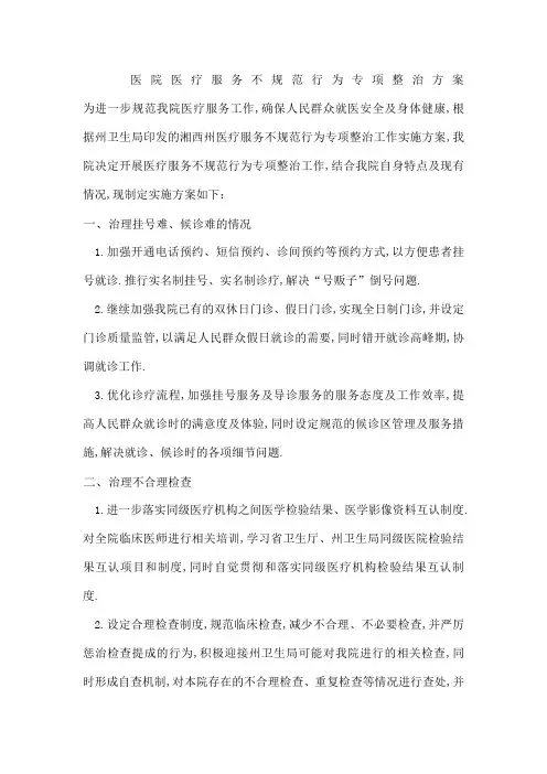医院医疗服务不规范行为专项整治方案为进一步规范我院医疗服务工作,确保人民群众就医安全及身体健康,根据州卫生局印发的湘西州医疗服务不规范行为专项整治工作实施方案,我院决定开展医疗服务不规范行为专项整治工作,结合我院自身特点及现有情况,现制定实施方案如下:一、治理挂号难、候诊难的情况1.加强开通电话预约、短信预约、诊间预约等预约方式,以方便患者挂号就诊.推行实名制挂号、实名制诊疗,解决“号贩子”倒号问题.2.继续加强我院已有的双休日门诊、假日门诊,实现全日制门诊,并设定门诊质量监管,以满足人民群众假日就诊的需要,同时错开就诊高峰期,协调就诊工作.3.优化诊疗流程,加强挂号服务及导诊服务的服务态度及工作效率,提高人民群众就诊时的满意度及体验,同时设定规范的候诊区管理及服务措施,解决就诊、候诊时的各项细节问题.二、治理不合理检查1.进一步落实同级医疗机构之间医学检验结果、医学影像资料互认制度.对全院临床医师进行相关培训,学习省卫生厅、州卫生局同级医院检验结果互认项目和制度,同时自觉贯彻和落实同级医疗机构检验结果互认制度.2.设定合理检查制度,规范临床检查,减少不合理、不必要检查,并严厉惩治检查提成的行为,积极迎接州卫生局可能对我院进行的相关检查,同时形成自查机制,对本院存在的不合理检查、重复检查等情况进行查处,并给予典型事例的相关人员全院通报及一定的惩罚措施以加强我院自身工作的落实程度.三、治理不合理用药1.落实处方点评制度.按照医院处方点评管理规范试行进行处方点评制度,将处方点评结果纳入对相关科室及相关工作人员绩效考核和医师定期考核指标体系,对于开具超常处方的医师按照处方管理方法的规定予以处理.同时将处方点评结果和处理情况定期上报州卫生局.2.加强抗菌药物及特殊用药,特别是麻醉药品、第一类精神药品的管理和监控.加强对限制使用级抗菌素的监控,并对特殊使用级抗菌素的品种和用量定期呈报.对于麻醉药品、第一类精神药品等特殊使用的药品进行相关的医、药双方面监督,对于该类药物的临床使用及处方开具加强规范,同时要求药师对药物进行审核、调配、发放时,做到规范管理,避免滥用、错用此类药物的发生.3.加大对辅助用药适应性检查的力度,规范临床医疗中辅助药物的使用,同时予以监督,防止滥用或无指征使用辅助药物的行为,对于发生此类行为的医师进行严厉处理.四、治理不合理治疗1.对医务人员奖金、工资等收入分配与药品耗材、医学检查等直接挂钩的行为进行严厉查处,杜绝此类行为的发生,同时严厉打击“医托”行为.禁止医务人员通过任何形式引导患者进行医疗活动时收取提成行为.2.进一步规范与落实接受大型检查、使用贵重药品、使用高新技术、使用高值医用耗材等患者知情告知制度,加大监督检查力度,同时继续加强临床自费药物使用前的知情告知情况,维护患者及家属的知情权.4.加强各科室医疗文书书写及管理的规范,严格落实病历书写基本规范和医疗核心制度,规范医疗行为.5.继续加强临床路径的开展和管理.扩大临床路径管理覆盖面,落实好我院的临床路径管理制度,严格做好临床路径的出、入径及变异管理.五、治理违规收费1.严格执行有关文件要求,组织各临床、医技科室医务人员认真学习和掌握医疗服务价格规范,所有收费标准一律按省级或市县级标准执行;坚持一切财务收支活动纳入财务部门统一管理,医疗服务价格采用计算机统一划价,取消各医技、临床科室的划价权,杜绝人为乱划价、乱收费现象.2.成立物价计量科,并建立各科室物价小组.为更好地规范各项收费,医院专职物价员定期对临床科室、重点环节的物价计量进行监督、检察;同时,为使小组成员了解和掌握有关物价、计量的法律、法规和规定进行专职培训,掌握物价政策.3.制作医疗收费项目及价格公示栏,严格执行住院费用清单制和查询制度,提高了收费透明度.通过自查目前我院严格按照湖南省医院收费标准执行,没有发现医疗项目分解收费、私设项目收费,以及比照收费和重复收费等违规行为.。