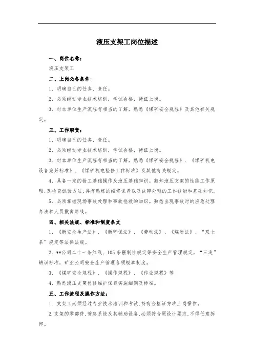 液压支架工岗位描述一、岗位名称:液压支架工二、上岗必备条件:1、明确自己的任务、责任。