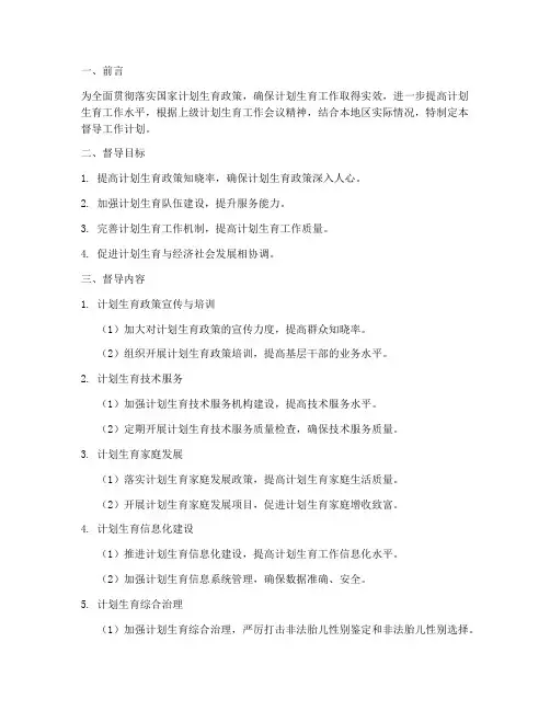二、加强政策落实监督工作1. 加强与相关部门的合作,监督各个单位和个人履行计划生育政策的责任和义务。