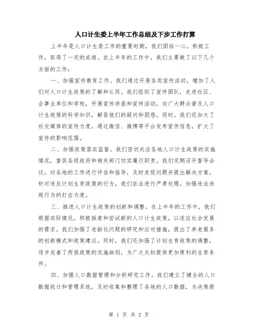 2024年计生委上半年工作总结及下半年的计划范文2024年上半年工作总结尊敬的领导、各位同事:大家好!2024年的上半年,是我国计划生育委员会(以下简称计生委)在全面建设社会主义现代化国家的新时代背景下,扎实开展工作的重要时期。