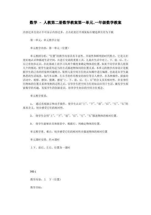 数学 - 人教第二册数学教案第一单元_一年级数学教案内容过多且设计不可显示内容过多,点击此处打开或鼠标右键选择另存为下载第一单元:单元教学计划单元教学内容:第一单元(位置)单元教材分析:“位置”的教学内容具有丰富性、开放性和鲜明的时代特点,它是人们更好地认识和描述生活空间,并进行交流的重要工具。