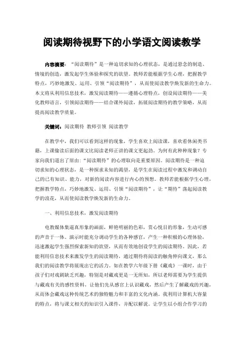 本文将从利用信息技术,激发阅读期待——遵循心理特点,创设阅读期待——美化教师语言,引领阅读期待——结合课外阅读,拓展阅读期待的教学策略,从而提高阅读教学质量。