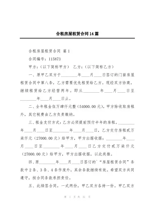 合租房屋租赁合同14篇合租房屋租赁合同篇1合同编号:115873甲方:(以下简称甲方)乙方:(以下简称乙方)一、原甲乙双方于________年____月____日签订的门面房屋租赁合同中第八条,乙方需要优先租赁给乙方。