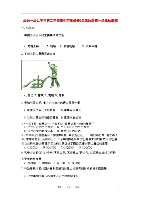 2010-2011学年第二学期高中历史必修2单元检测第一单元检测题一.选择题1.中国传统农业的主要耕作方式是A.刀耕火种B.耜耕 C.石器助耕 D.铁犁牛耕2.下图中的农具最早出现在A、西汉B、曹魏C、南朝D、唐朝3.春秋战国时期,小农经济出现的最主要条件是A.各国变法承认土地私有B.牛耕逐步普及C.铁制农具出现和逐步普及D.家庭观念加强4.“一夫不耕,或受之饥;一女不织,或受之寒”这句话反映了A.小农经济的生产方式 B.手工业经济的生产方式C.古代妇女的地位较高 D.商品经济的发达5.(07年山东)白居易诗:“机梭声札札,牛驴走纭纭。
