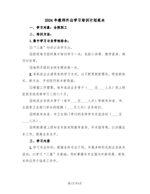 2024年教师外出学习培训计划范本一、学习对象:全院职工二、培训方法:1.集中学习与自学相结合:①“三基”知识以自学为主。