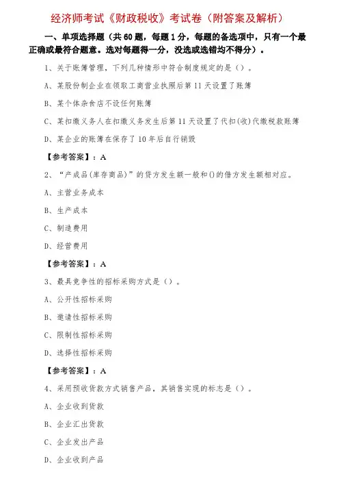 经济师考试《财政税收》考试卷(附答案及解析)一、单项选择题(共60题,每题1分,每题的备选项中,只有一个最正确或最符合题意。