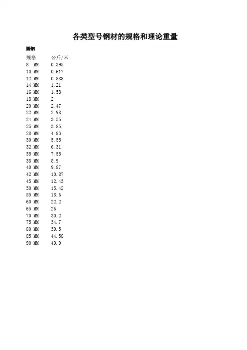 各类型号钢材的规格和理论重量圆钢规格公斤/米8 MM 0.39510 MM 0.61712 MM 0.88814 MM 1.2116 MM 1.5818 MM 220 MM 2.4722 MM 2.9824 MM 3.5525 MM 3.8528 MM 4.8330 MM 5.5532 MM 6.3135 MM 7.5538 MM 8.940 MM 9.8742 MM 10.8745 MM 12.4350 MM 15.4255 MM 18.660 MM 22.265 MM 2670 MM 30.275 MM 34.780 MM 39.585 MM 44.5890 MM 49.9焊管热镀锌管规格公斤/米规格公斤/米DN15 1.26 1/2″ 1.33DN20 1.63 3/4″ 1.73DN25 2.42 1″ 2.57DN32 3.12 11/4″ 3.32DN40 3.84 11/2″ 4.07DN50 4.88 2″ 5.17DN65 6.64 21/2″ 7.04DN80 8.34 3″ 8.84DN100 10.85 4″ 11.5DN125 15.04 5″ 15.94DN150 17.81 6″ 18.88DN200 31.52 8″ 33.41扁钢花纹板钢板规格公斤/米规格公斤/㎡规格公斤/㎡16*2 0.25 3 MM 26.6 1 MM 7.8520*3 0.47 4 MM 34.4 1.2 MM 9.4225*3 0.59 5 MM 42.3 1.5 MM 11.77530*3 0.71 6 MM 50.1 1.8 MM 4.3640*4 1.26 8 MM 65.8 2.0 MM 15.750*5 1.96 2.5 MM 19.633.0 MM 23.5560*6 2.8370*7 3.8580*8 5.0290*9 6.36100*10 7.85100*8 6.28工字钢规格公斤/米10# 11.261 12# 13.987 12#B 14.223 14# 16.89 16# 20.513 18# 24.143 20# 27.929 20#B 36.524 22# 33.07 22#B 36.524 24# 37.477 24#B 41.245 25# 38.105 25#B 42.03 27# 42.825 27#B 47.084 28# 43.492 28#B 47.888 30# 48.084 30#B 52.794 32# 57.741 32#B36# 60.037 36#B 65.689 40# 67.589 40#B 73.87 50#B 101.554角钢(等边)槽钢规格公斤/米规格公斤/米20*3 0.889 5# 5.438 25*3 1.124 6.3# 6.634 30*3 1.373 6.5# 6.709 40*4 2.422 8# 8.046 50*5 3.77 10# 10.007 63*6 5.721 12#A 12.059 70*7 7.398 12#B 12.318 75*7 7.976 14# 14.535 75*8 9.03 14#B 16.733 80*8 9.658 16# 17.24 80*10 11.874 16#B 19.752 90*8 10.946 18# 20.174 90*10 13.476 18#B 23100*10 15.12 20# 22.637 110*10 16.69 20#B 25.777 125*10 19.133 22# 24.999 125*12 22.696 22#B 28.453 140*12 25.522 24# 26.86 140*14 29.49 24#B 30.628 160*12 33.987 25# 27.41 160*14 38.518 25#B 31.335 180*16 43.542 27# 35.077 180*18 48.634 27#B 39.316 200*18 54.401 28# 35.823 200*20 60.056 28#B 40.219 200*24 71.168 30# 34.46330#B 39.173无缝钢管计算公式为:外径-臂厚*臂厚*0.02466=每米重量例如:ф159*5无缝钢管每米重量计算为:【159-5*5*0.02466=19.988公斤/米】螺旋焊管计算方法与无缝钢管相同.(试用于焊接钢管).螺旋焊管每米另加0.5公斤钢板重量计算方法为:长*宽*厚*7.85例如:一块8.5米长1.8宽厚为12MM的钢板重量为:【8.5*1.8*12*7.85=1441.26公斤】扁钢的重量与钢板相同.圆钢螺纹钢每米重量计算方法为:直径*直径*0.617例如:计算ф85MM圆钢【85*85*0.00617=44.578公斤/米】18MM螺纹钢每米重量:【18*18*0.00617=2.00公斤/米】不锈钢的比重为:8.00 铝的比重为:2.8常用金属材料重量计算公式(每千克重量)园钢重量(公斤)=0.00617×直径×直径×长度方钢重量(公斤)=0.00785×边宽×边宽×长度六角钢重量(公斤)=0.0068×对边宽×对边宽×长度八角钢重量(公斤)=0.0065×对边宽×对边宽×长度螺纹钢重量(公斤)=0.00617×计算直径×计算直径×长度角钢重量(公斤)=0.00785×(边宽+边宽-边厚)×边厚×长度扁钢重量(公斤)=0.00785×厚度×边宽×长度钢管重量(公斤)=0.02466×壁厚×(外径-壁厚)×长度钢板重量(公斤)=7.85×厚度×面积1. 钢材的理论重量钢材的理论重量是按钢材的公称尺寸和密度(过去称为比重)计算得出的重量称之为理论重量。